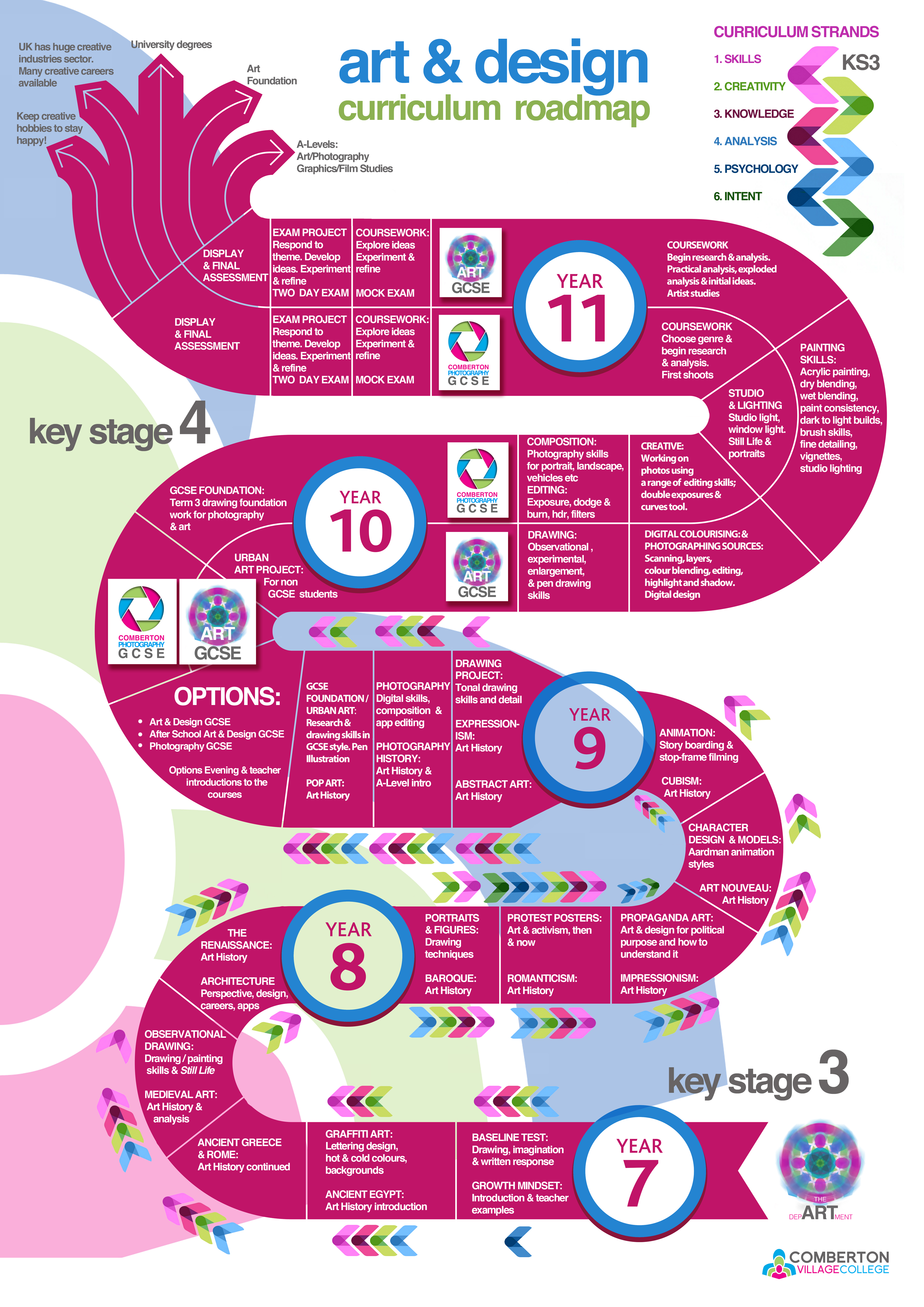 Our KS3 curriculum has been carefully designed to offer a wide range of practical skills taught over term-length projects to provide the sufficient depth for expertise. It is designed as a three-year course to cover a great range of skills and a sequential run of art history, from Egyptian art to Pop Art, that links into their class studies.