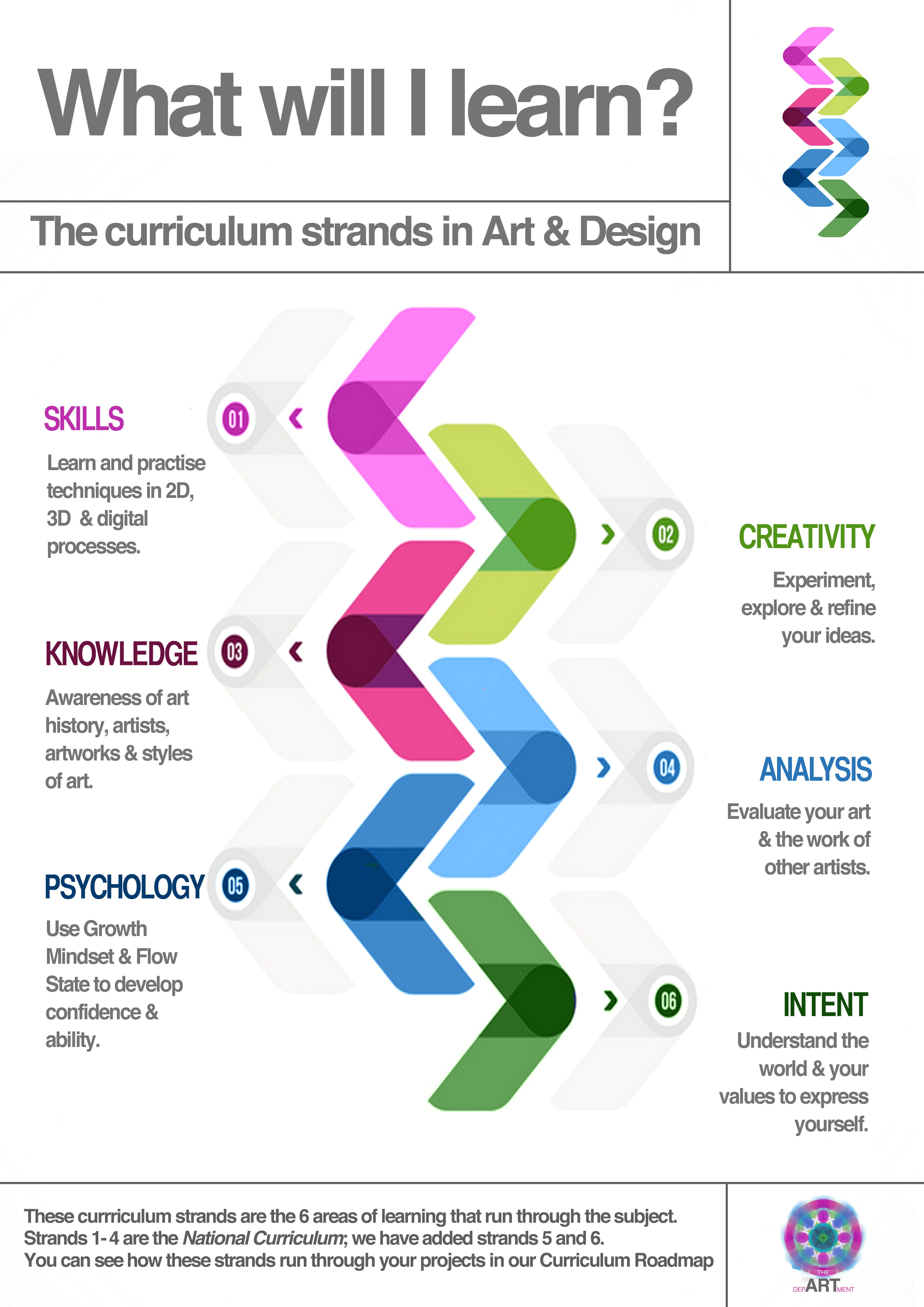 In Art History projects, pupils are introduced to thirteen key periods through presentations, analysis sessions and a choice of practical responses to produce art inspired by the period. There are opportunities for homework extensions to visit our amazing local range of museums and galleries to really experience the artefacts, architecture and artworks. At the end of each project there is a core knowledge test that aims to build up a strong sequential knowledge of art history.