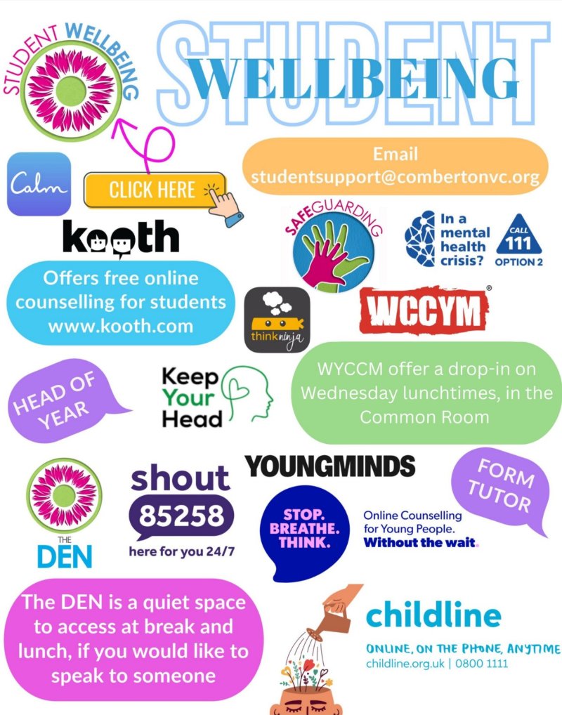 If you have concerns about your child’s well-being that are non-urgent and need advice the school has an email address which is checked daily – this is: studentsupport@combertonvc.org.Students can also email this address to seek non-urgent support and advice.